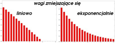 Okazuje się że w analizie technicznej, jak majstrowanie przy grafikach się szumnie nazywa, praktyczne jest czasem jeszcze wydatniejsze uprzywilejowanie najświeższych wartości, przy jednoczesnym wytłumieniu wpływu jaki na naszą średnią mają wartości starsze. Można to elegancko osiągnąć poprzez wagi wykładniczo opadające, takie jak po prawej stronie w grafiku powyżej. Utworzona w ten sposób ważona średnia krocząca nosi nazwę EMAexponential moving average.