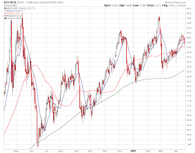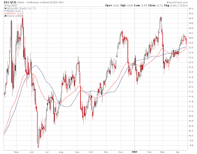 Widzimy tu niebieską linię odpowiadającą MA(12), czyli średniej kroczącej obejmujacej 12 dni (handlowych). Zgodnie z oczekiwaniami, linia ta w miarę ściśle pokrywa się z dziennymi zmianami ceny. Czerwona MA(50) jest średnią średnioterminową, i wykazuje dużo mniejsze wahania. W zasadzie mówi nam ona że mimo lokalnych panik tu i ówdzie srebro jest w 2007 w stabilnym trendzie wznoszącym. Długoterminowa średnia MA(200) (linia zielona) obejmująca 200 dni jest jeszcze bardziej łagodna, wykazując jedynie lekkie opóźnienie w okolicach przełomu roku i lekkie przyspieszenie +/- obecnie. Specjalnie ciekawe rzeczy wynikają z wzajemniej interakcji dwu MAs o różnym zakresie. Zwrócimy na to uwagę w kolejnym odcinku tego cyklu.