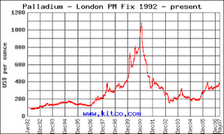 Zanim cynik9 uznany zostanie za nie wpełni poczytalnego oczekiwacza na cuda (:-D) przyjrzyjmy się jaki efekt miała nie tak dawno taka wpadka w siostrzanym metalu – palladzie. Wspomniany kilka razy wcześniej pallad jest metalem tej samej grupy co platyna, i jej głównym konkurentem na rynku konwerterów katalitycznych. Pallad jest na ogół znacznie tańszy od platyny. O ile w platynie Afryka Płd. rozdaje karty kontrolujac podaż, z Rosja na dalekim drugim miejscu, w palladzie sytuacja jest mniej więcej odwrotna. Tu Rosja i jej Norilsk Nickel kontroluje ponad 51% światowej podaży palladu. Do głośnej wpadki doszło w 2000 r, a jej źródłem była prozaiczna administracyjna decyzja o jednostronnym wstrzymaniu eksportu palladu przez Rosję.