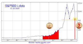 Dopiero w końcu stycznia 2009, po trwającej blisko 10 lat szerokiej formacji „topowania” i przy wzrastającym z jesiennych spadków złocie indeks S&P500 ponownie spadł poniżej wartości uncji złota w dolarach (na poziomie ok. 820). Od tego czasu złoto pnie się wyżej, a S&P500 spada, pogłębiając tą różnicę.