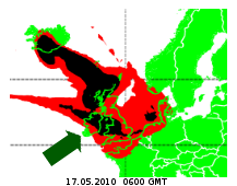 Mapa zasięgu pyłu wulkanicznego chroniącego ostatnio Irlandię przed zbytnim napływem emigrantów i turystów. Czarny – nic nie lata. Czerwony – najprawdopodobniej coś nie lata; sprawdź ze swoim przewoźnikiem. Zielony – okay.
