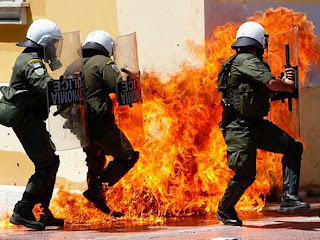 Że co proszę? Odpowiedzialność w demokracji? Toż prędzej piekło zamarznie niż raz rozpuszczony dyktaturą ulicy socjał stanie się odpowiedzialny i się cofnie. W Atenach jak widać (foto – Reuters) socjał aż się pali aby zacząć swoją samoamputację. Niby kryzys, niby sytuacja poważna, a de Maziere’a trzymają się jeszcze żarty.