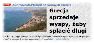 Drodzy czytelnicy wskazują na powtórzone w prasie polskiej doniesienia Guardiana że aby zacząć spłacać swoje gigantyczne długi Grecja zaczęła ostatnio sprzedaż własnych wysp. Informacji nie sprawdzaliśmy ale sam zamiar wygląda nam na ruch ze wszech miar racjonalny. W końcu między greckim długiem a greckimi wyspami jest jedna podstawowa różnica. W odróżnieniu od greckiego długu greckie wysepki mają mianowicie pewną wartość. Z tego powodu jedynym klientem na niewiele warty dług zbankrutowanej Grecji jest zmuszony do skupowania śmieci ECB.