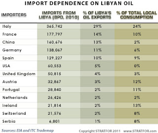 ENI is also a partially state-owned firm and is thus susceptible to inefficiency and a lack of propensity to rise to technical challenges. As such, ENI has simply been unable to secure new energy sources except on terms set by others. Unsurprisingly, it has seen its market share eroded by a more adept private challenger, Edison. All told, Italy has to find about 60 billion cubic meters (bcm) of natural gas a year to cover the country’s natural gas deficit. Despite the drawbacks of partnering with someone like Gadhafi, Libya can provide about 11 bcm — and ENI, fully supported by the central government in Rome, gets all of it. Italy — via ENI — is also Libya’s single largest oil consumer, with most of the rest going elsewhere in Europe.