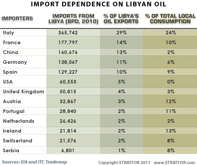 ENI is also a partially state-owned firm and is thus susceptible to inefficiency and a lack of propensity to rise to technical challenges. As such, ENI has simply been unable to secure new energy sources except on terms set by others. Unsurprisingly, it has seen its market share eroded by a more adept private challenger, Edison. All told, Italy has to find about 60 billion cubic meters (bcm) of natural gas a year to cover the country’s natural gas deficit. Despite the drawbacks of partnering with someone like Gadhafi, Libya can provide about 11 bcm — and ENI, fully supported by the central government in Rome, gets all of it. Italy — via ENI — is also Libya’s single largest oil consumer, with most of the rest going elsewhere in Europe.